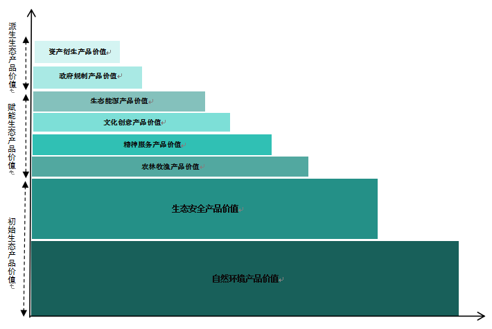 通過分析,本文認(rèn)為生態(tài)產(chǎn)品價(jià)值可以理解為初始生態(tài)產(chǎn)品價(jià)值、賦能生態(tài)產(chǎn)品價(jià)值、派生生態(tài)產(chǎn)品價(jià)值,且生態(tài)產(chǎn)品價(jià)值的構(gòu)成比例呈現(xiàn)階梯型分布特征(圖3)。初始生態(tài)產(chǎn)品價(jià)值是指生態(tài)系統(tǒng)最基礎(chǔ)、最核心的價(jià)值,是其他所有價(jià)值衍生的源頭,主要包括生態(tài)安全產(chǎn)品價(jià)值、自然環(huán)境產(chǎn)品價(jià)值;賦能生態(tài)產(chǎn)品價(jià)值是指在初始生態(tài)產(chǎn)品價(jià)值基礎(chǔ)上,通過適度的人工勞動(dòng)、技術(shù)投入、管理優(yōu)化或品牌建設(shè)等手段,對(duì)初始生態(tài)產(chǎn)品進(jìn)行品質(zhì)提升、功能拓展、效率提高,將其轉(zhuǎn)化為可直接滿足人類物質(zhì)和精神需求的、更具市場交易屬性的產(chǎn)品或服務(wù),主要包括農(nóng)林牧漁產(chǎn)品價(jià)值、精神服務(wù)產(chǎn)品價(jià)值、文化創(chuàng)意產(chǎn)品價(jià)值、生態(tài)能源產(chǎn)品價(jià)值等;派生生態(tài)產(chǎn)品價(jià)值是指在初始產(chǎn)品和賦能產(chǎn)品價(jià)值的基礎(chǔ)上,通過制度設(shè)計(jì)、金融創(chuàng)新以及市場機(jī)制所衍生的,代表生態(tài)價(jià)值產(chǎn)權(quán)或政策目標(biāo)的抽象化、金融化或規(guī)制性價(jià)值,主要包括資產(chǎn)衍生產(chǎn)品價(jià)值、政府規(guī)制產(chǎn)品價(jià)值等。