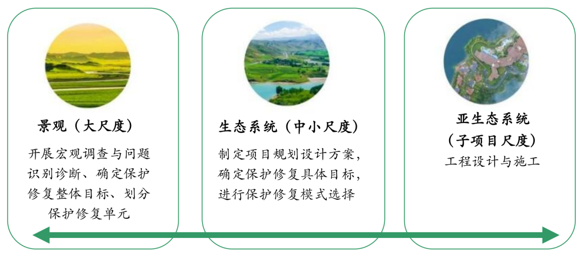 從大尺度向小尺度或從小尺度向大尺度進行梯度分析、類比分析、綜合評判,分析評價區(qū)域生態(tài)空間格局,生態(tài)系統(tǒng)質(zhì)量及服務(wù)功能,特別是珍稀瀕危物種及棲息地狀況,科學(xué)診斷生態(tài)系統(tǒng)的脆弱性、敏感性,以及受損的面積、分布、程度。并針對不同層次解決的問題及保護修復(fù)目標(biāo),確定各尺度上開展的工作。