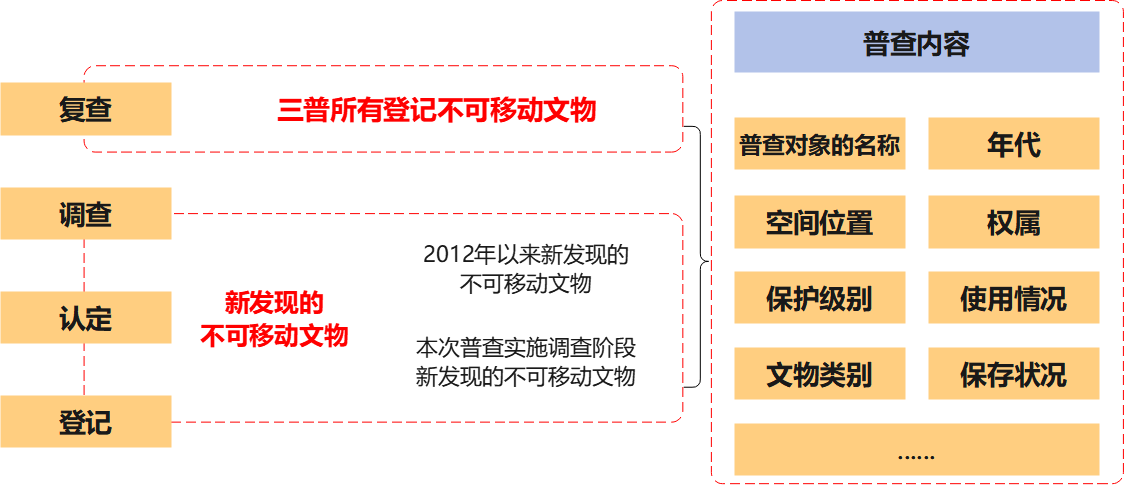 (2)普查對已認(rèn)定、登記的不可移動文物進(jìn)行復(fù)查,同時(shí)調(diào)查、認(rèn)定、登記新發(fā)現(xiàn)的不可移動文物。普查的主要內(nèi)容如下: