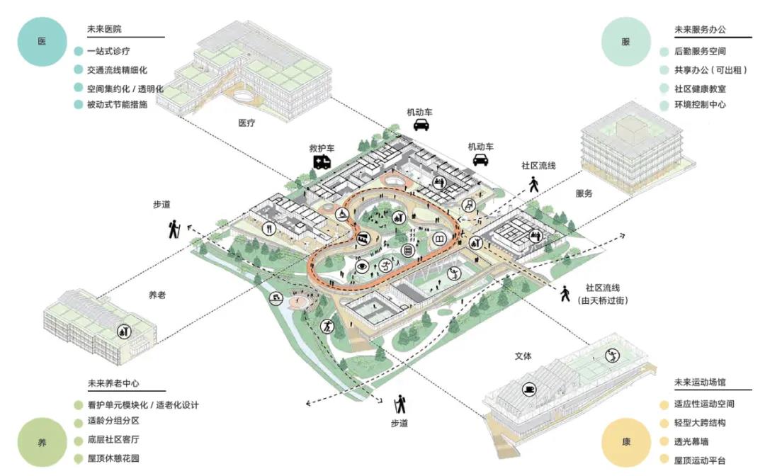 隨著科技的發(fā)展、遠(yuǎn)程醫(yī)療技術(shù)的不斷完善,健康需求的多樣化和社區(qū)層面的健康管理越來(lái)越受到重視,將醫(yī)療服務(wù)與社區(qū)功能有機(jī)結(jié)合已成為未來(lái)醫(yī)療設(shè)施設(shè)計(jì)的重要方向。這種整合不僅提高了醫(yī)療服務(wù)的效率和覆蓋度,還促進(jìn)了社區(qū)成員的健康意識(shí)和生活質(zhì)量。城市健康單元的設(shè)計(jì)強(qiáng)調(diào)醫(yī)、康、養(yǎng)健康促進(jìn)設(shè)施有機(jī)結(jié)合,提高了健康促進(jìn)設(shè)施的可達(dá)性,并分層級(jí)融入社區(qū)居民生活中。